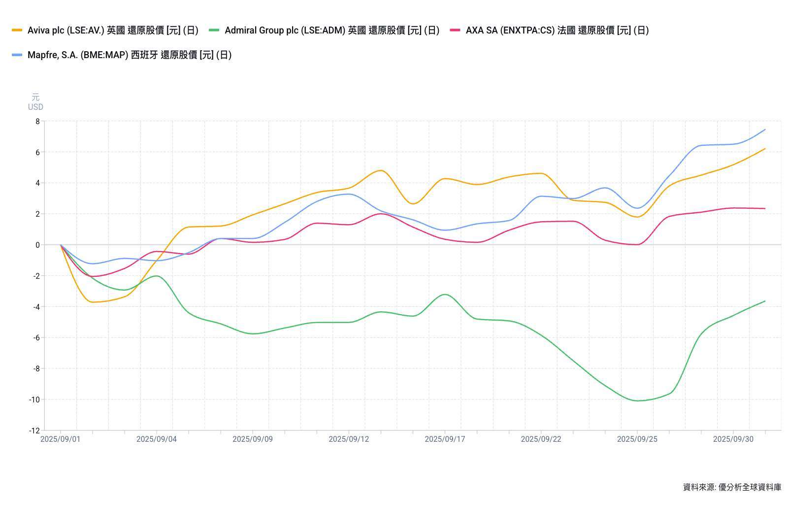 負面情緒隨後擴散至歐洲市場。多家主要保險公司同步走低,包括Hiscox(HSX-LN)、Mapfre(MAP-MC)、Admiral(ADM-LN)、Aviva(AV-UK)以及AXA(CS-PA),跌幅多落在2%至3%之間。