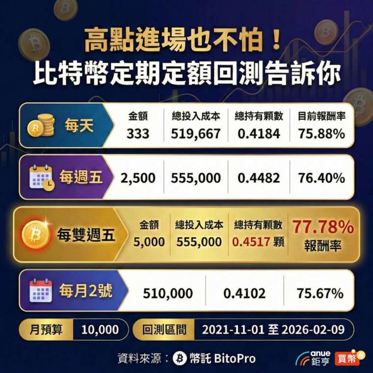 這種方式能攤平你的成本,即便在高點進場,被套牢的時間也比一次性投入短得多。 你還可以設定「價格上限」(例如超過 98,000 美元就不買),完全自動化操作。