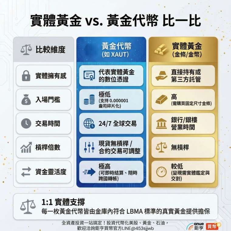 「黃金代幣」就是把黃金搬到區塊鏈上來做交易,1:1 對應實體黃金的價格,是屬於「實體資產支持型」的穩定幣,它跟掛鉤美金的 USDT 不同,它的價值來源是真實世界的黃金。這類代幣成為了傳統貴金屬市場與加密貨幣世界之間的橋樑。