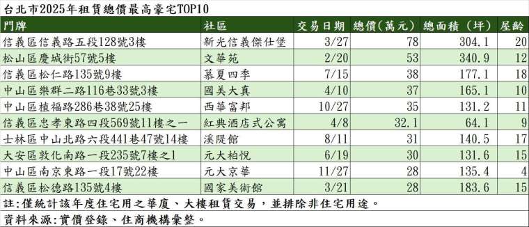 台北市最新的租賃豪宅排行榜出爐,房仲業者統計實價登錄,台北市 2025 年十大豪宅租金排行榜中,由信義區僅租不售的飯店式管理豪宅「新光信義傑仕堡」,以單月租金高達 78 萬元的驚人天價奪下榜首。信義區是豪宅客群首選,10 大租賃豪宅有四名在信義區。