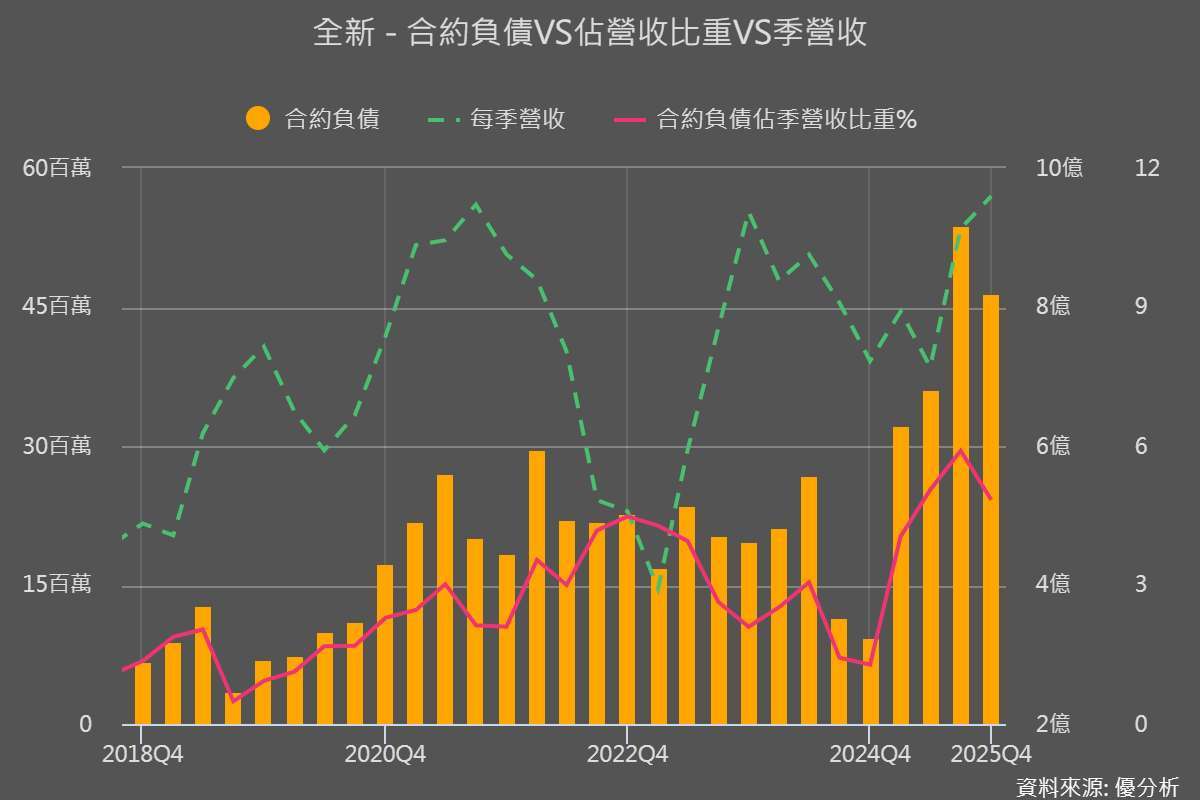 同步觀察合約負債金額在 2025 年一路上升,第四季仍維持高檔,可反映客戶預付款與在手訂單增加,訂單能見度提升。
