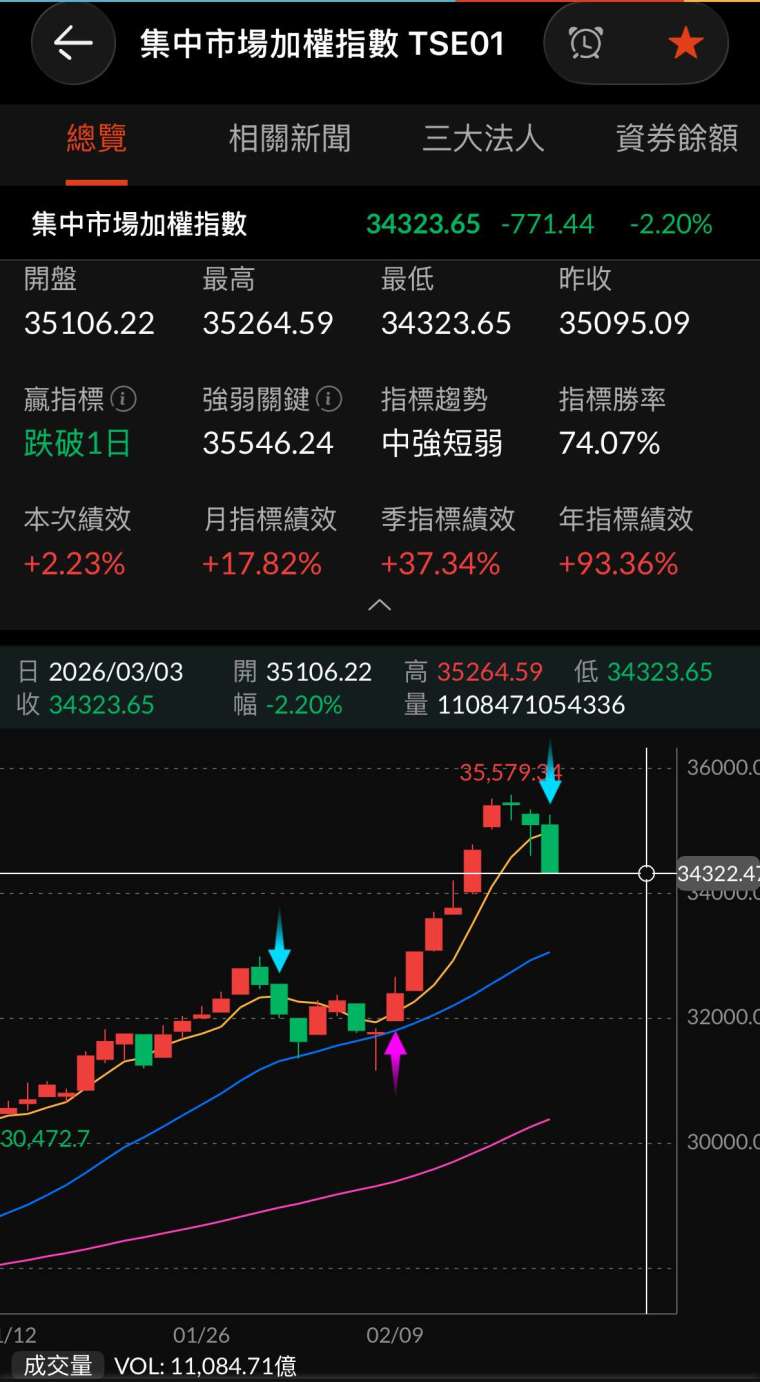 台股大盤今日(3) 遭遇強烈賣壓,終場重挫 771 點,以 34,232 點 作收,不僅跌破 5 日線,也失守 3 萬 5 千點大關,成交量創史上第二高,外資賣超 947 億元,三大法人合計買賣超 1154.02 億元。