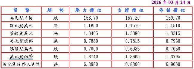 隨著路透 / 益普索最新調查顯示,美國與伊朗衝突抑制全球石油供應,汽油價格上漲已開始對美國家庭財務造成衝擊,絕大多數美國人預計燃料成本將繼續攀升,並據美國數據顯示 2 月全國活動指數降至負 0.11 及 1 月建築支出較前月下滑 0.3% 遜於預期,而且美國總統川普表示與伊朗進行良好且富有成效的對話,將下令任何針對伊朗發電廠和能源基礎設施的軍事打擊行動推遲五天,緩和緊張情緒,打擊美元兌日圓跌至 158.02 低點。預估今日美元兌日圓阻力於 158.70-90,支撐於 157.00-20。
