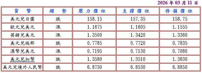 美國總統川普認為對伊朗戰爭可能早於先前設定時間表結束,但警告德黑蘭若封鎖荷姆茲海峽石油運輸,將升級打擊力度,伊朗則回應封鎖行動持續至美國與以色列襲擊結束,但週二亞洲股市上漲及油價回落,導致避險美元走軟;此外,日本政府數據顯示 1 月家庭支出分別較前月與上年同期意外降 2.5% 及 1.0%,但去年第四季國內生產總值 (GDP) 環比年率修正成長 1.3% 超出預期及企業資本支出上修為 2023 年第四季以來最大增幅 1.3%,並據日本財務大臣片山皋月希望政府與日本央行 (BOJ) 密切合作致力實現 2% 通貨膨脹目標,強調目標應伴隨工資增長,而且 BOJ 理事中村康治表示鑒於 BOJ 占據債券市場重要地位,以可預測方式逐步縮減購買公債規模恰當,提供日圓支撐,美元兌日圓跌至 157.25 低點。