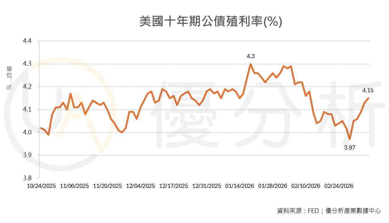 此外,除了通膨預期升高、可能迫使聯準會延後降息之外,軍事衝突也可能進一步擴大政府赤字,對公債殖利率形成額外上行壓力。由於債券價格與殖利率走勢相反,這也意味殖利率後續仍有進一步墊高的可能。