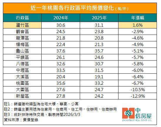 台北衛星城市的桃園憑藉相對親民的房價,成為不少「脫北族」購屋布局的首選。房仲業者彙整實價登錄資料發現,過去一年桃園多數行政區的平均房價變化均呈現負值,其中新屋區年跌幅達 12.9% 最為顯著,大園區下滑 10.5%。然而,但蘆竹區卻逆勢上揚,平均單價從 2024 年的每坪 30.6 萬元微幅攀升至 2025 年的每坪 31.1 萬元,年增 1.6%,成為桃園市唯一維持房價正成長的行政區。