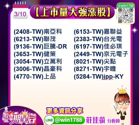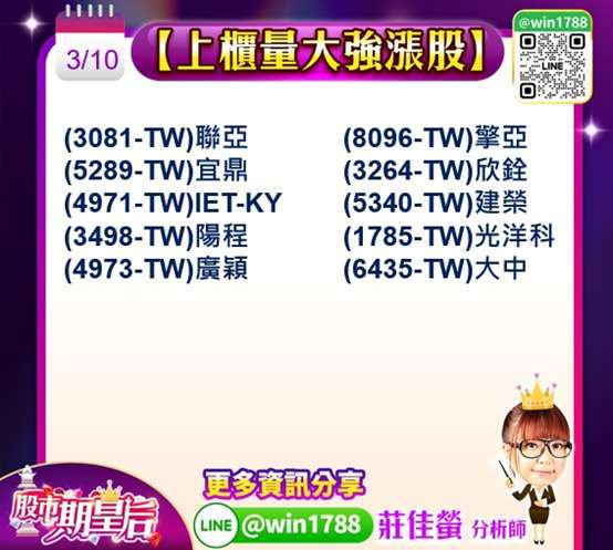 今日台股的大漲,上市融資減肥 107 億元 + 上櫃 77.37 億元 = 合計 184.37 億元,加上美國總統宣布戰爭很可能快速結束之下,激勵反彈向上,不過因為量能不足八千億元,漲幅收斂,不過已經出現止穩現象,展望後市,本週市場將聚焦多項重要事件,包括 3 月 11 日公布的美國 CPI 通膨數據與 3 月 13 日公布的 PCE 物價指標,同時 (ORCL-US) 甲骨文,財報與多家科技企業財報也將陸續揭曉,此外,市場也關注兩大科技展覽,包括輝達年度 AI 盛會 GTC 大會,以及 2026 年太空衛星展,預期 AI、半導體、衛星與高效能運算等相關族群仍有機會輪動表現,成為短線市場資金關注焦點。