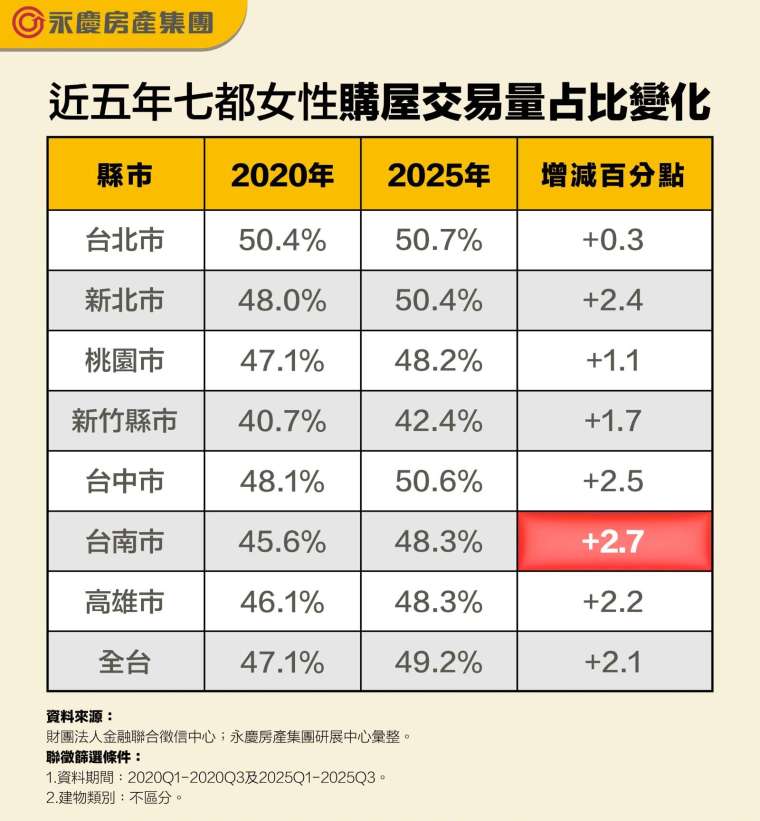 台南市女性購屋占比從 2020 年的 45.6% 提升至 2025 年的 48.3%,增加 2.7 個百分點,居七都之首。陳金萍指出,隨著南部科技產業聚落逐漸成形,帶動就業機會與薪資水準提升,使得當地女性的經濟與購屋能力同步提升。台南市房價相較北部親民許多,對於首購族或單身女性而言,購屋門檻較低,因此也提高女性置產的意願。
