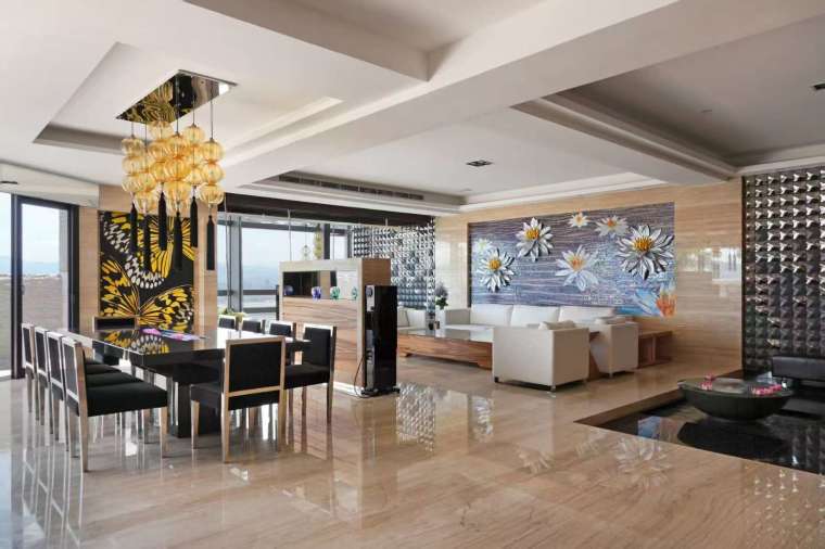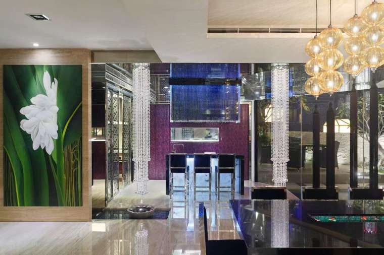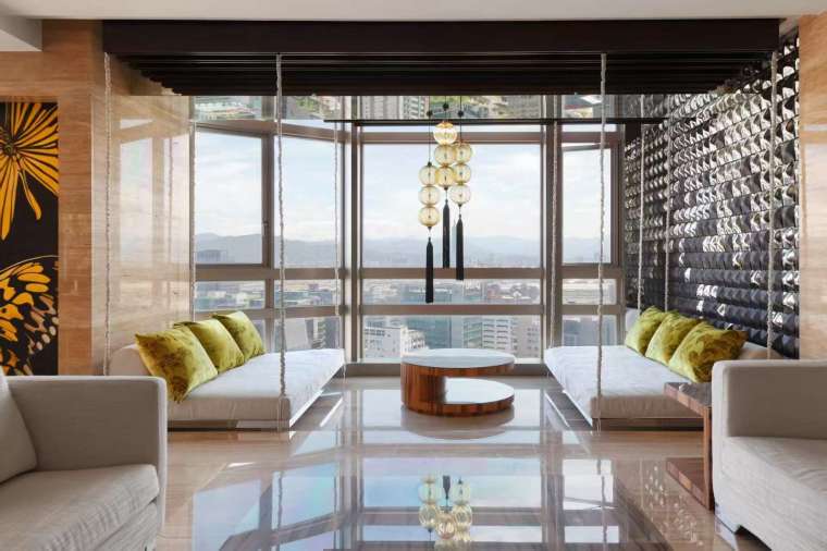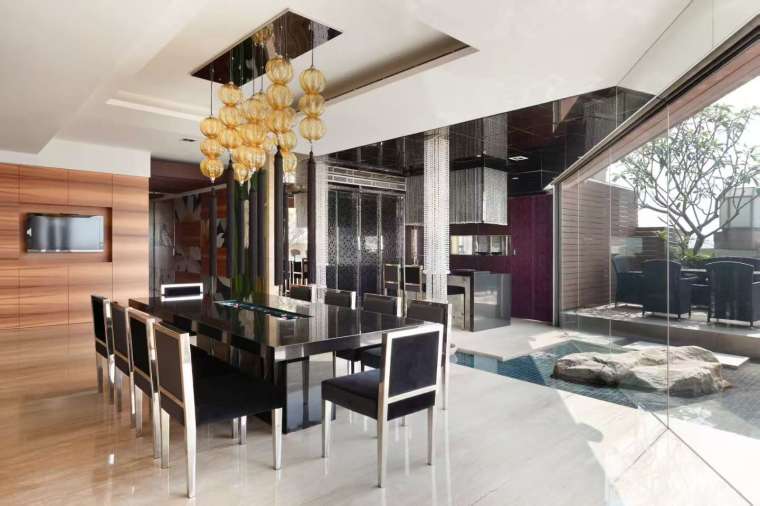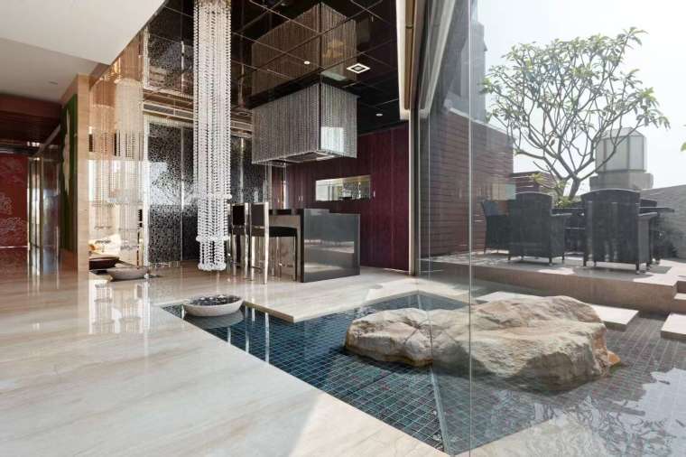 一塊石材自室外穿過玻璃,延伸至室內,打破空間的界限,形成富有動感的視覺亮點。人們可在高樓之上盡情體驗社交與放鬆的樂趣,也為空間注入靜與動的和諧平衡。大理石地板、石材與流動的水影彼此交織,每走幾步都能捕捉新的視角與光彩,令居住者在日常之中也能感受到脫俗的舒緩與愉悅。
