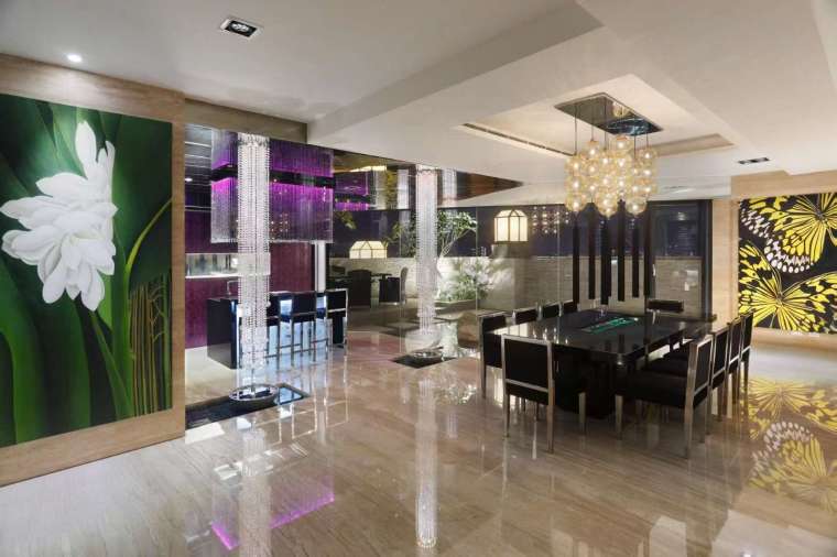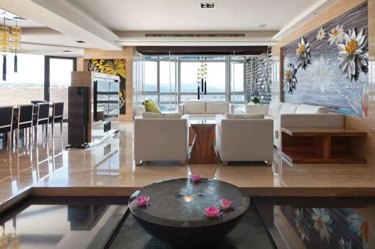 甫踏入門楣,活水與荷花的清香撲鼻而來,左、右兩側的水線在視野中柔和地綻放,猶如張開雙臂擁抱來訪者。前陽台的水瀑與室內水景交相輝映,水聲輕柔而綿長,引導視線流轉至客廳與吧台。特製的餐桌在中央挖有凹槽,可注入水流或擺放花朵,為用餐時刻增添浪漫與趣味。主牆以亮鉻陶磚與手工拼貼馬賽克妝點,在日光下散發低調華麗,夜晚則借燈光折射出絢爛光影。