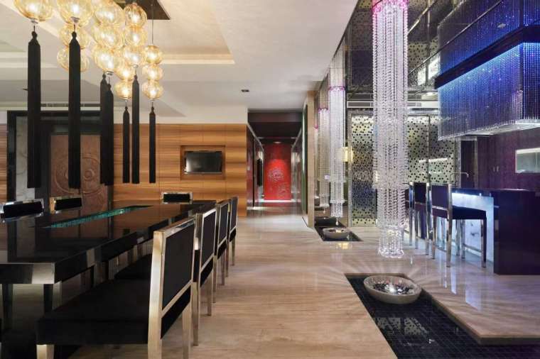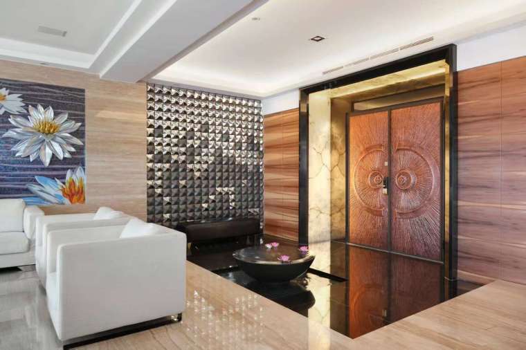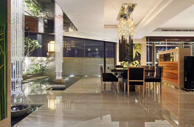 公共空間多以溫潤配色與柔和中性色系呼應室內水景的流動感,突顯明亮愜意的氛圍。大片落地窗迎接日光傾瀉而入,柔化石材的堅硬輪廓,也與波光的律動相得益彰。燈光則運用隱藏式手法,待夜幕降臨時,黑珍珠石材水缽與陶磚、施華洛世奇的水晶珠串與 LED 漸變換色燈,光影之間迸發更豐富的反射層次,讓白日與夜晚的居住情境各具魅力。