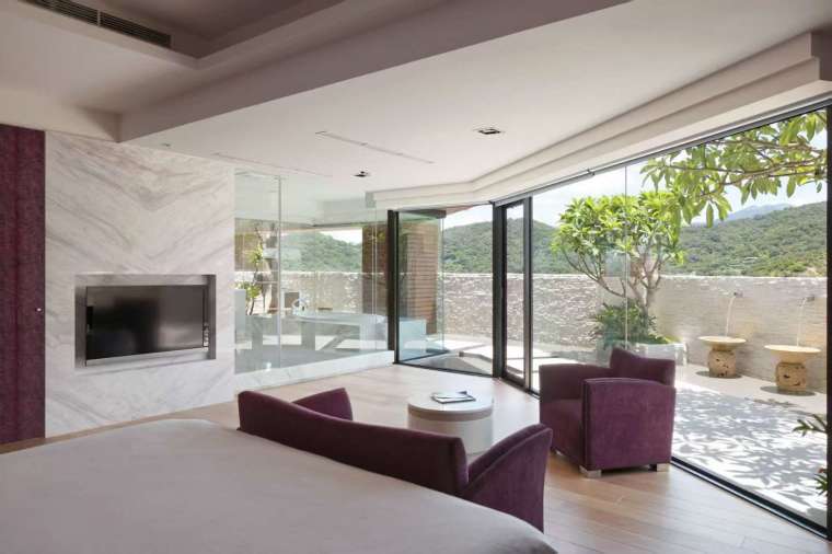 設計師以客製手工拼貼馬賽克與落地窗的明暗對比,將都市山景與室內水意完美融合。室內因 LED 漸變燈光而有異國度假情調,戶外更設有烤肉區、多功能休閒區域,讓水波、石材與燈影交織出獨特的舒適氛圍,完美演繹出精緻生活的極致享受。