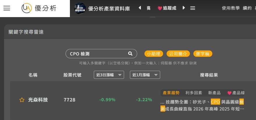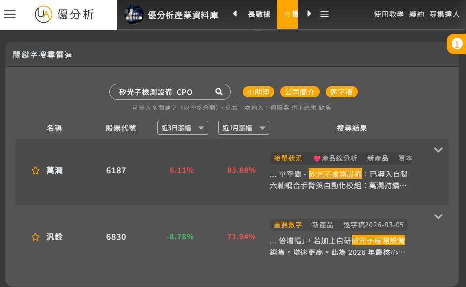 這塊市場在台灣沒有多少公司切入,汎銓掌握的是一個先行者的機會,我們透過優分析的搜尋雷達就可以直接尋找相關的公司。