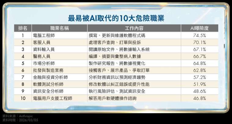 過去大眾普遍認為,AI 會優先取代「重複性高、技術門檻低」的工作,但最新研究卻顛覆這項認知。Anthropic 針對旗下大語言模型 Claude 在實際職場中的使用數據進行分析,發布《AI 對勞動市場影響報告》,該報告指出 AI 任務覆蓋率最高的職業,主要集中在編碼、研究、文件處理、數據分析與溝通等工作。