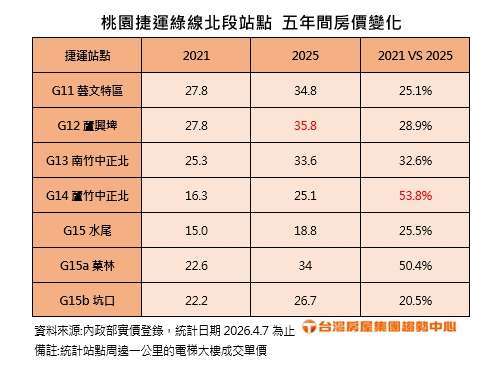 桃捷綠線率先通車的七站當中,電梯大樓單價漲幅最大的是 G14 蘆竹中正北站,從 2021 年的平均單價 16.3 萬元,到 2025 年漲至 25.1 萬元,等於五年之間漲幅 53.8%,漲勢最旺的站點。