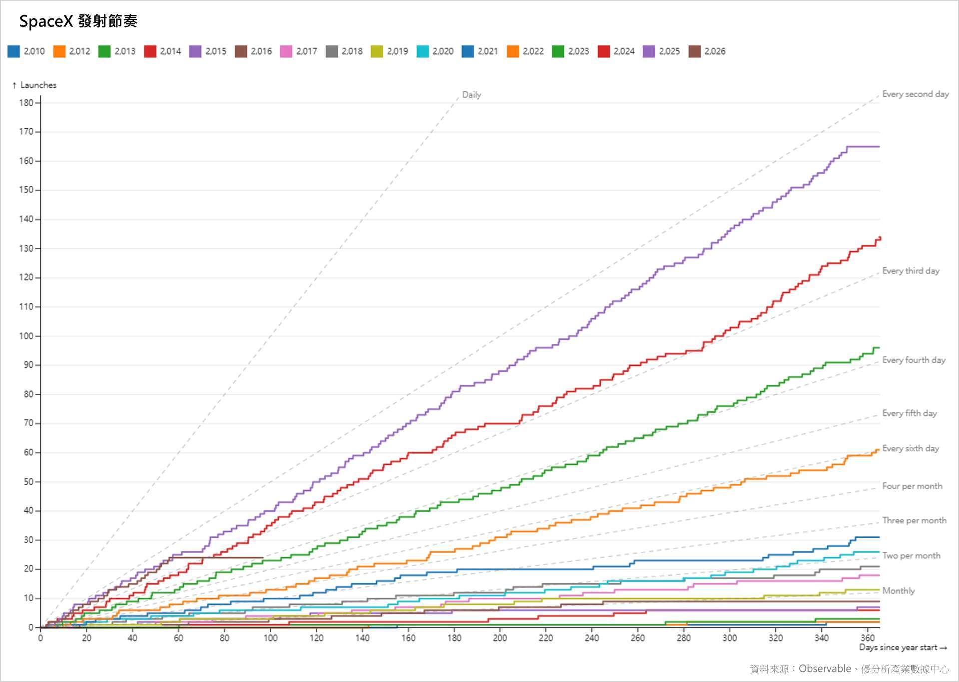 從發射節奏來看,SpaceX 在 2025 年的發射頻率已提升至接近每 2 至 3 天一次,顯示其已具備高度規模化與常態化的發射能力;相較之下,2025 年中國全年發射次數為 92 次,在發射頻率與連續性上仍存在差距,也進一步凸顯 SpaceX 在資源搶占速度上的優勢。