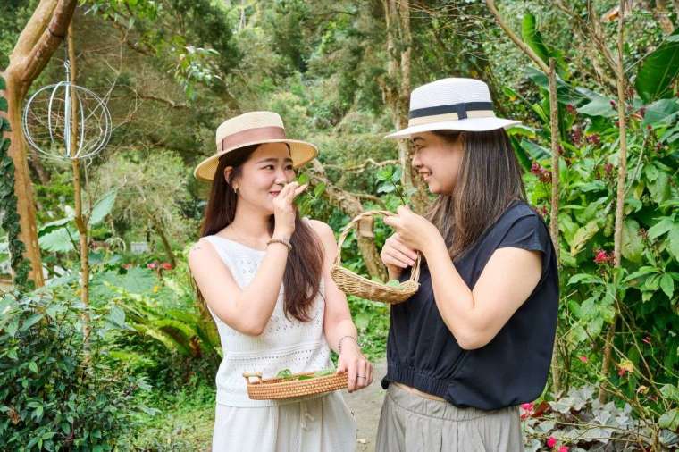 參加套裝遊程的旅客,除了在香草生態園區認識植物的氣味與用途,還可親手採集葉片,洗淨後依照自己個人喜好調配、沖煮兩款不同風味的香草茶,搭配鬆餅一同享用,在充滿香氣的空間中,看可愛的貓咪們慵懶午睡,享受悠閒的午後時光。