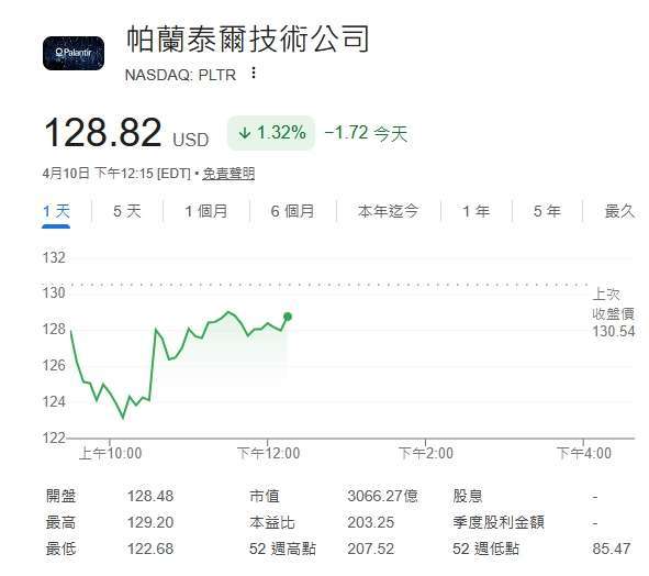 截稿前,Palantir(PLTR-US) 周五盤中股價下跌 1.32%,每股暫報 128.82 美元。