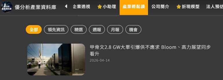 2026年04月14日(優分析/產業數據中心報導)⸺ 燃料電池廠Bloom Energy(BE-US)宣布,甲骨文Oracle(ORCL-US)將向該公司採購最多2.8 GW燃料電池系統,以支援AI與雲端基礎建設擴張,消息帶動Bloom盤後股價大漲。