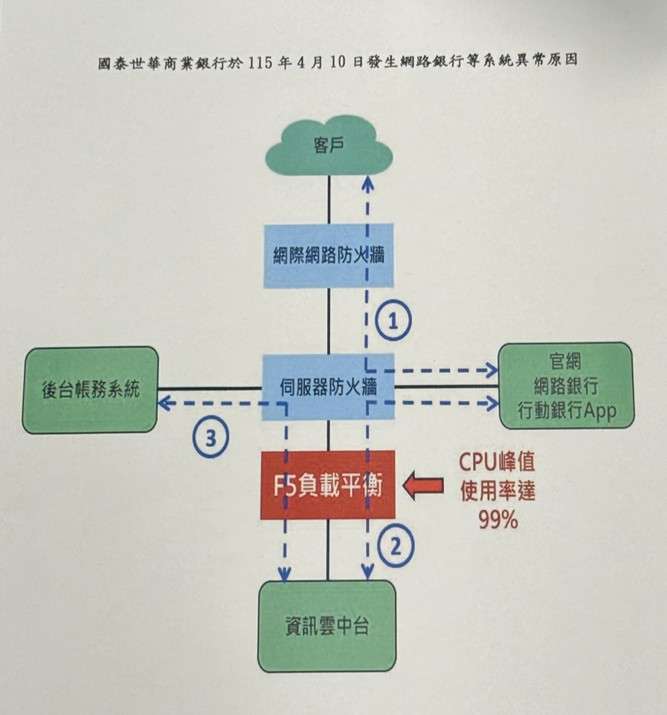 銀行局副局長王允中透過流程分解圖來說明,這次問題出在「F5 負載平衡」,他解釋,該設備功能如同交通警察,負責將流量分流至後端的中台與後台系統。事發時,該設備的 CPU 使用率 (峰值) 飆升至 99%,達到系統極限,導致處理效能嚴重遲滯,但尚未完全當機。