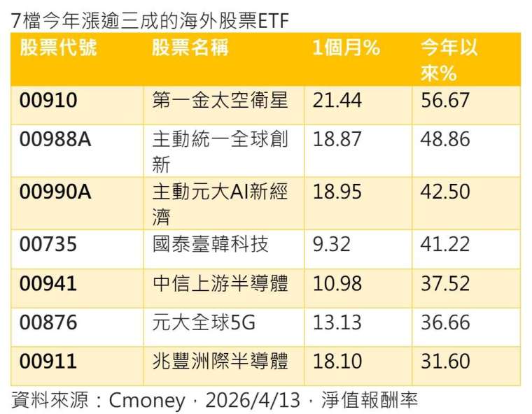 美伊戰事新一輪談判可望啟動,帶來停火曙光,金融市場提前反應大漲,7 檔海外股票 ETF 今年以來漲幅已逾三成,且在過去一個月戰火亂勢中仍見強攻上揚。今年漲幅逾三成的海外 ETF 中,第一金太空衛星 (00910-TW) 累計漲幅達 56.67%,遙遙領先其他各檔主、被動海外 ETF。
