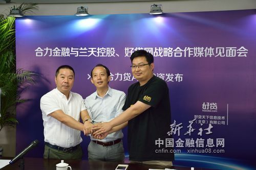 合力貸創始人兼CEO劉豐(中)與蘭天控股董事長張建友(左)、好貸網創始人兼總裁李明順(右)在A輪融資發布會上。