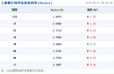 上海銀行間同業拆放利率(Shibor)顯示,隔夜Shibor報1.8470%,上漲1.70個基點;7天Shibor報2.5990%,上漲1.30個基點;3個月Shibor報3.0900%,下跌0.30個基點。