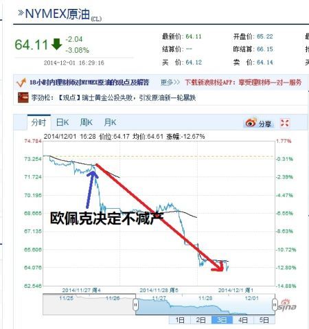 新浪財經訊 北京時間12月1日下午消息,周一國際油價再次大幅下跌,歐佩克宣佈不減決定以來,累計跌幅達到13%左右。
