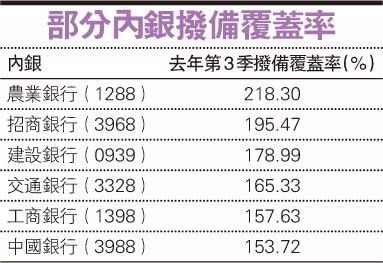 目前上述7家銀行的撥備覆蓋率都達標,根據去年第3季的數據,農行的撥備覆蓋率超過200%,而最低的是中行及工行,分別只有153.72%及157.63%,只達到中銀監的最低要求水平。