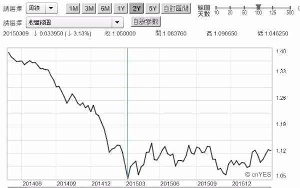 (圖二:歐元兌換美元匯率周曲線圖,鉅亨網首頁)