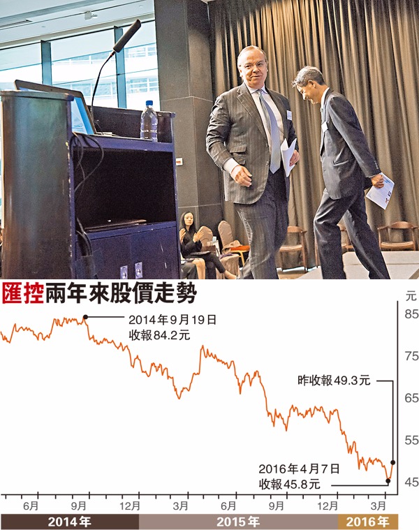 滙控近年受美國指控協助洗黑錢,旗下瑞士私人銀行亦涉幫富貴客戶避稅,令股價每況愈下,今年來股價累跌20.68%,上周五收報49.3元,表現是藍籌股中第二差,僅次於累跌20.72%的國壽,該股上周五收報19.74元。滙控在倫敦股市的股價過去12個月亦累跌1/3,報4.505鎊,引發股東不滿,要求推行管理層改革。