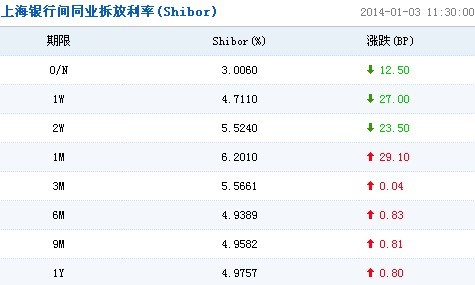 上海銀行間同業拆放利率(Shibor)顯示,短期利率方面,隔夜利率跌12.5個基點,至3.0060%;7天期利率跌27個基點,至4.7110%;14天期利率跌23.5個基點,至5.5240%;1個月期利率漲29.1基點,至6.2010%。
