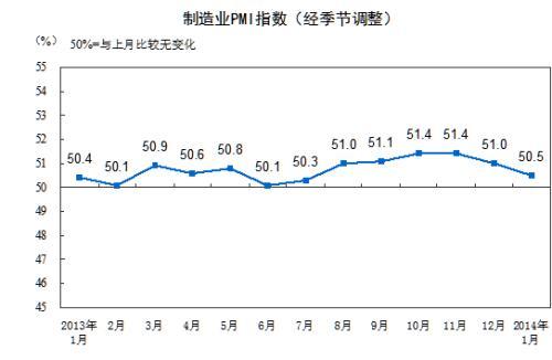 2014年2月1日國家統計局服務業調查中心和中國物流與采購聯合會發布的中國制造業采購經理指數顯示,2014年1月中國制造業PMI為50.5%,盡管比上月回落0.5個百分點,但連續16個月位於臨界點以上,表明我國制造業繼續保持增長態勢。