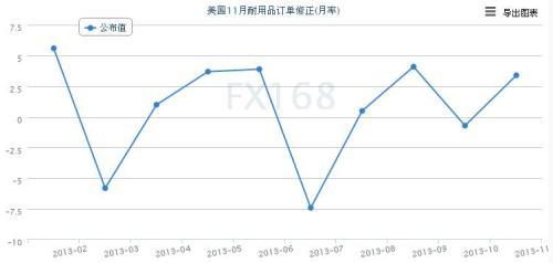 ????其中扣除運輸的工廠訂單較上月上揚0.6%,10月份為上揚%;扣除國防的工廠訂單月率上升1.8%,10月份為持平。扣除飛機的非國防用品訂單上揚4.1%,前值下滑0.6%。