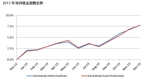 對沖基金指數十二月上升了0.99%,使得2013的年度收益率達到8.02%。msci全球指數十二月回報率在1.67%,2013 全年收益率增漲了21.1%。