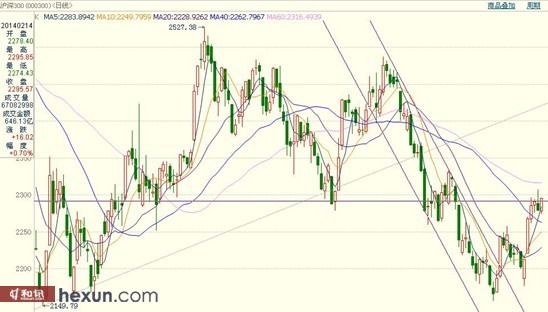 價格形態:經過節后一周的反彈,今日滬深300指數首次站上圖中的壓力支撐線,后市料將挑戰2300點整數關口。今日收盤價創出節后的新高,也是近一個多月的新高。從形態看,反彈目標位可以看至前高2333點附近。