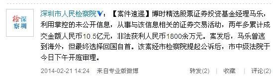基金原博時基金經理馬樂曾逃到海外 最終回國自首鉅亨網新聞中心2014-02-21 17:03 2月21日下午訊息,原博時基金經理馬樂,涉嫌利用職務之便掌握的未公開資訊炒股,非法獲利1800萬余元。深圳市中級人民法院將於今日下午正式開庭審理這宗“老鼠倉”案件。 深圳市人民檢察院官方微博公布,博時精選股票證券投資基金經理馬樂,利用掌控的未公開資訊,從事與該資訊相關的證券交易活動,兩年多累計成交金額人民幣10.5億元,非法獲利人民幣1800余萬元。案發后,馬樂曾逃到海外,但最終選擇回國自首。該案經市檢察院提起公訴后,市中級法院於今日下午開庭審理。文章標籤更多鉅亨講座看更多講座公告上一篇通膨疑慮加深 原物料需求加溫 金價上看1400美元下一篇台股仍在技術面上升軌道 逢回分批佈局0