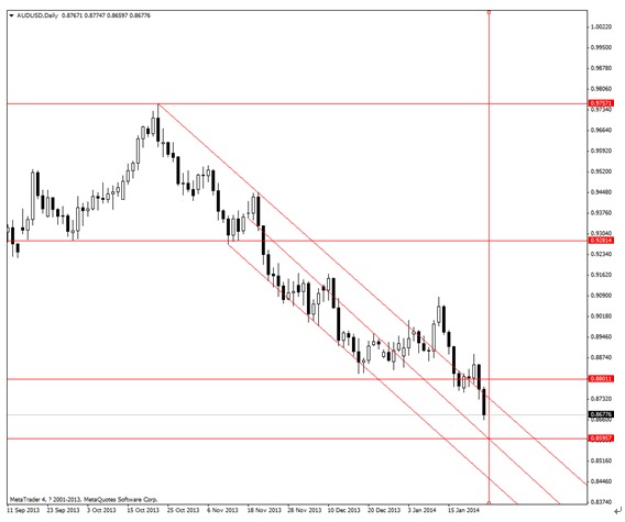 從技術角度分析來看,澳元/美元仍可引起關注。僅從天圖分析來看,價位再次墜落於下降頻道之內,中短期可依然看空,參考目標位為0.8600附近。