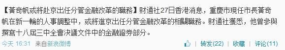 據財通社訊息,重慶市市長黃奇帆或將赴京出任分管金融改革職務。據悉,黃奇帆曾參與撰寫十八屆三中全會決議檔案中的金融證券部分。