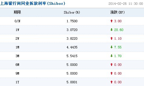 上海銀行間同業拆放利率(Shibor)顯示,短期利率方面,隔夜利率上漲3.00個基點至1.7500%;7天期利率下跌20.60個基點至3.0720%;14天期利率上漲1.10個基點至3.8220%;1個月期利率下跌7.55個基點至4.4435%。
