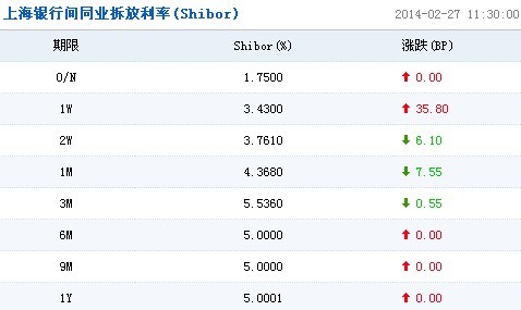 上海銀行間同業拆放利率(Shibor)顯示,短期利率方面,隔夜利率持平於1.7500%;7天期利率上漲35.80個基點至3.4300%;14天期利率下跌6.10個基點至3.7610%;1個月期利率下跌7.55個基點至4.3680%。