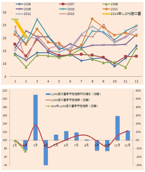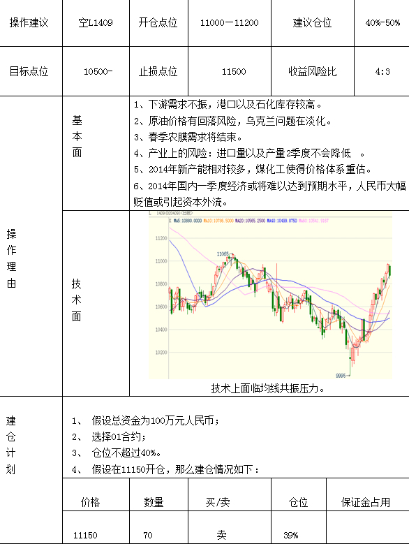 福建聯合轉產與廣州石化檢修的情況下,3月新增供需預估調整為基本平衡,3月開始lldpe產業鏈庫存快速積累的時期告一段落,pe石化庫存近期小幅降低,但依舊在90萬噸以上,庫存壓力依舊較大。貿易商3月上半月pe庫存上升明顯,港口庫存位於2013年年初至今的最高位;總體而言,上游庫存偏高,去庫存意愿依舊較強;接近二季度,下游需求逐漸轉淡,去庫存難度增加;若現貨價格轉弱可少量介入l1409空單,關注外盤價格的走勢及其對進口量的影響。風險點在於外盤價格堅挺,進口虧損幅度較大,對四月進口量抑制或較為嚴重。