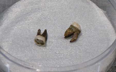 在展覽現場,隋煬帝墓內兩顆出土牙齒引來不少人圍觀,據了解,這兩顆牙齒出土於墓內靠近東耳室處,屬於同一個體,一顆為右側上頜第三臼齒,一顆為右側下頜第二臼齒。根據牙齒磨耗判斷的齒齡為 50 歲左右,與隋煬帝被弒殺時的年齡相符。