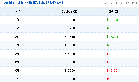 上海銀行間同業拆放利率(Shibor)顯示,短期利率方面,隔夜利率下跌11.70個基點至2.1810%;7天期利率下跌0.5個基點至2.7210%;14天期利率下跌23.90個基點至2.7640%;1個月期利率下跌2.50個基點至4.0600%。