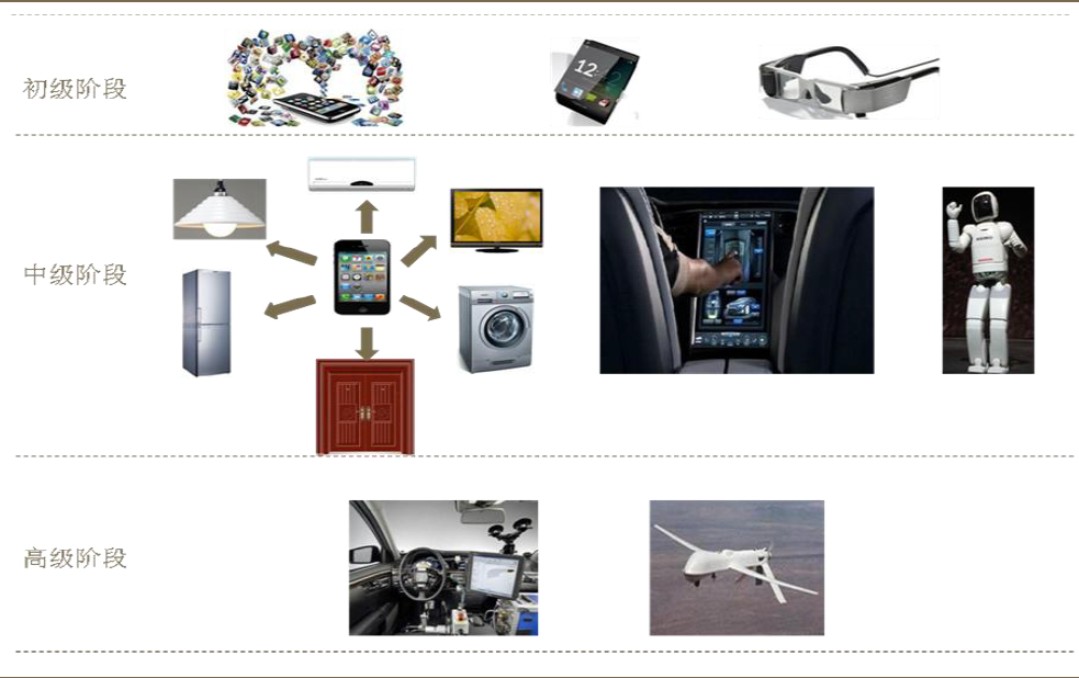 我們認為移動互聯網的演變要經歷3個階段:初級階段終端的普及和app的野蠻成長,同時可穿戴設備興起;中級階段是在可穿戴設備演變的基礎上演變出的初級的智慧控制技術,主要是智慧家居、智慧汽車和智慧機器人(300024,股吧);高級階段是在多種技術發展的基礎上產生的無人駕駛、各種高智慧無線機器人。