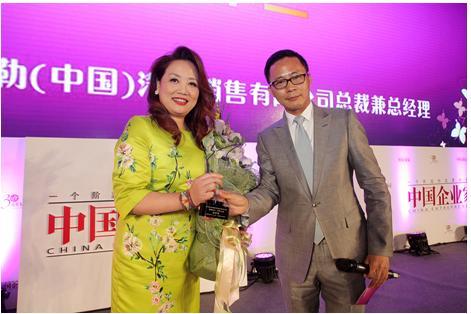 圖片:蒙牛乳業總裁孫伊萍接過“2014年商界木蘭年度人物”獎杯