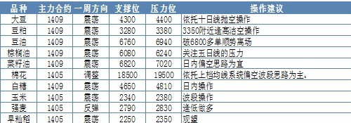 本周最後一個交易日,鄭糖期貨小幅低開后震盪走升,尾市小幅下跌報收。技術上看,主力合約期價交易中心繼續下移,長期均線的支撐岌岌可危,期價仍然有望向下挑戰4650一帶的支撐。當前的國內市場充滿矛盾,一方面國家收儲預期仍在,另一方面消費淡季之下現貨價格難有起色;國際市場亦是如此,調降甘蔗產量和降雨出現並存。因此,只要技術面不破位,當前市場難以形成新的方向,延續區間震盪。豆油今日下破了60日均線支撐,長上影線也說明了期價受菜油即將輪儲30萬噸的拖累上行壓力顯現,6800整數關口將繼續被測試,下周若被破多單順勢離場。菜油今日超跌反彈,盤中下破6900后收回,但macd綠柱有逐步放大趨勢,日內偏空思路為宜。馬棕油的出口減少使得bmd期價走勢承壓,馬盤的回調限制了內盤的漲勢,連棕油一直跟盤回落,今日雖報收陽線,但期價上行乏力,關注五日線的壓力。鄭麥主力合約1405今日期價走強,突破短期均線壓制,一改往日頹廢走勢,反彈行情已經形成,預計還有繼續上行空間,操作上建議逢低買入為主。早秈稻1405今日小幅震盪,收一小陽線,小盤多作怪,建議投資者觀望為主。美棉繼續高位震盪走勢,主力05合約期價回試下檔短期均線支撐力度。鄭棉市場震盪收低,短期弱勢整理格局明顯,多方護盤力度趨弱,密切關注短期走勢力度,操作上,依托均線系統偏空波段思路為主。今日玉米主力合約1405合約繼續減倉回調走勢疲軟,重心略有下移,關注2380-2330的震盪區間。操作上,保持波段思路。今日雞蛋期貨主力合約1409出現再度沖高的走勢,最高至4608元,逼近前期高點4618元,技術繼續呈現高位震盪的態勢,操作上,順勢而為。