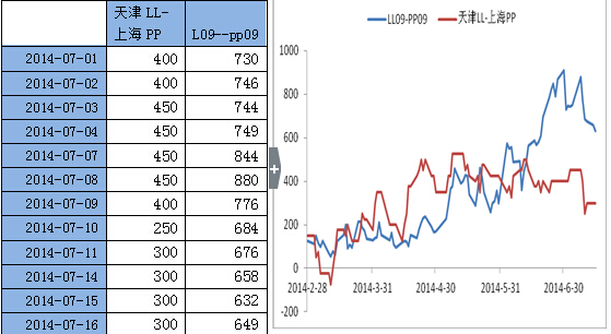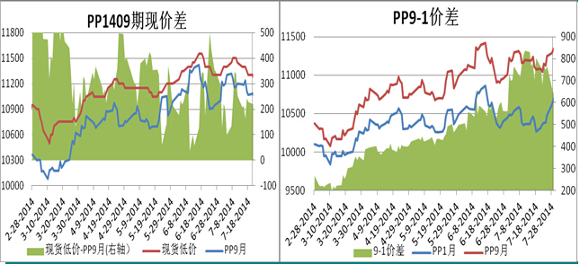 隨著交割月臨近,受到期現套利盤影響,期貨現貨價格趨向收攏。pp1409貼水pp現貨300元左右,處於較大值一線。由於pp1409合約貼水較大,價格通常表現為易漲難跌,而pp1501則由於離交割日期更遠,受期貨升貼水的影響相對要小。即在下跌的過程中,由於pp1409貼水現貨而表現得較為抗跌;上漲的過程中,pp1409更容易向現貨回歸。因此,pp期貨貼水的結構為9-1價差的擴大提供驅動。