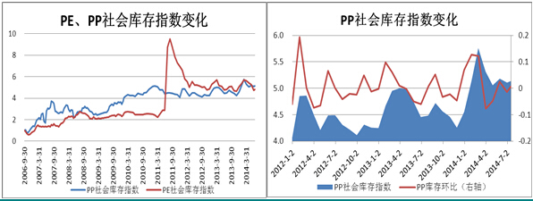中塑庫存:截至2014年7月16日,國內pp、pe主要市場總庫存回升,較上月底環比增加1.32%,與上年同期比增加8.27%。其中 pe庫存上升,較上月底增加1.58%,比上年同期增加10.05%。