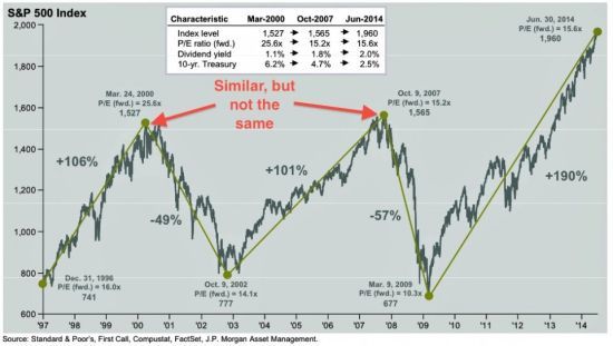 新浪財經訊 北京時間9月1日下午消息,如果僅看下圖,人們或認為1990年代末的科技泡沫非常像近十年后的信貸泡沫,但兩個泡沫並不一樣,實際上非常不同。